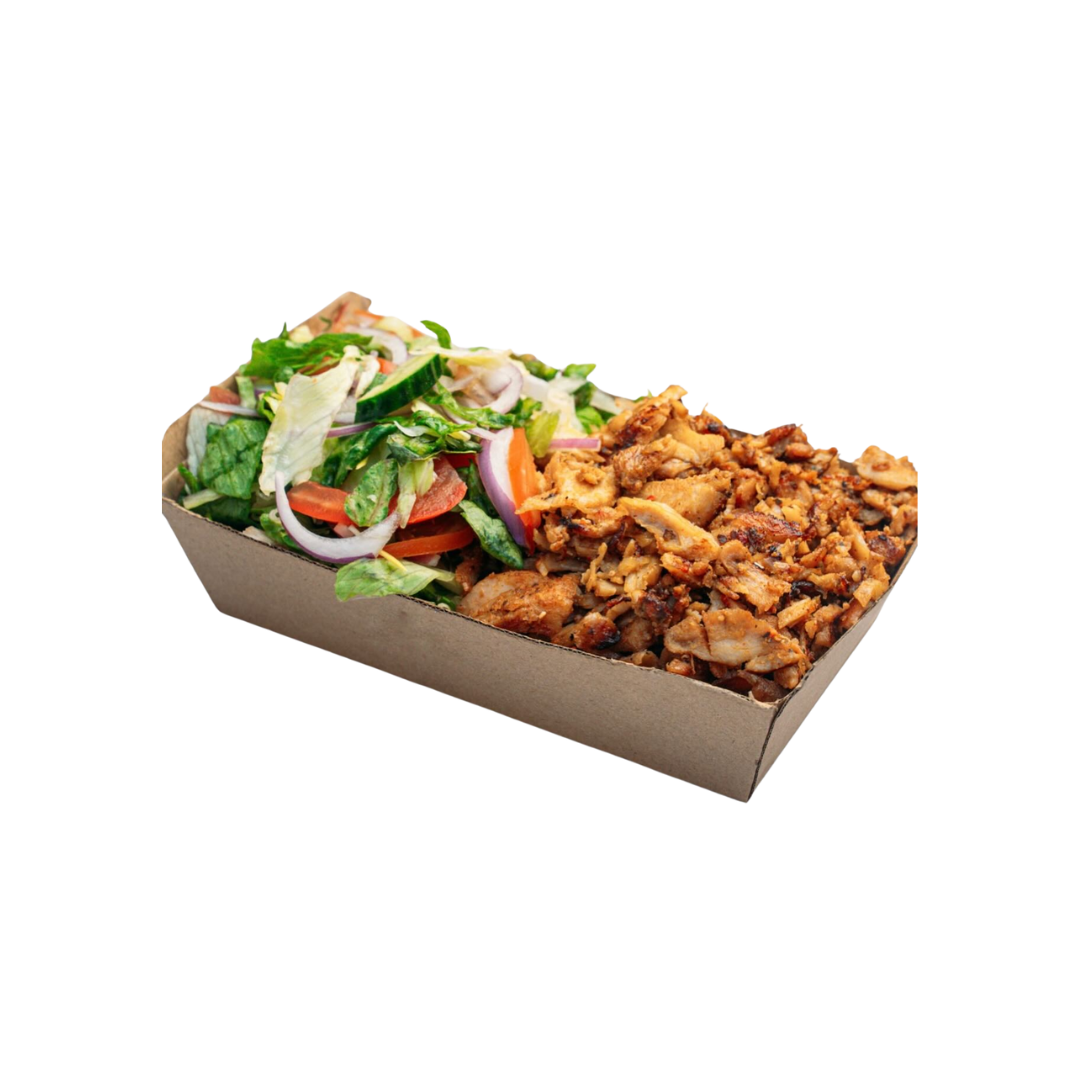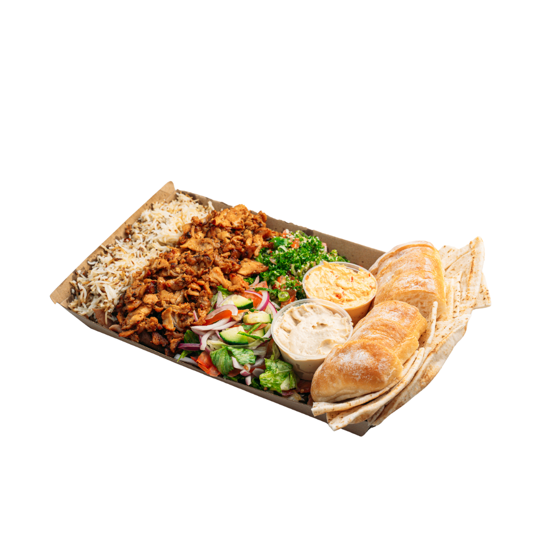 Grilled chicken wrapped in soft pita with crisp lettuce, tomato, onion, and garlic sauce