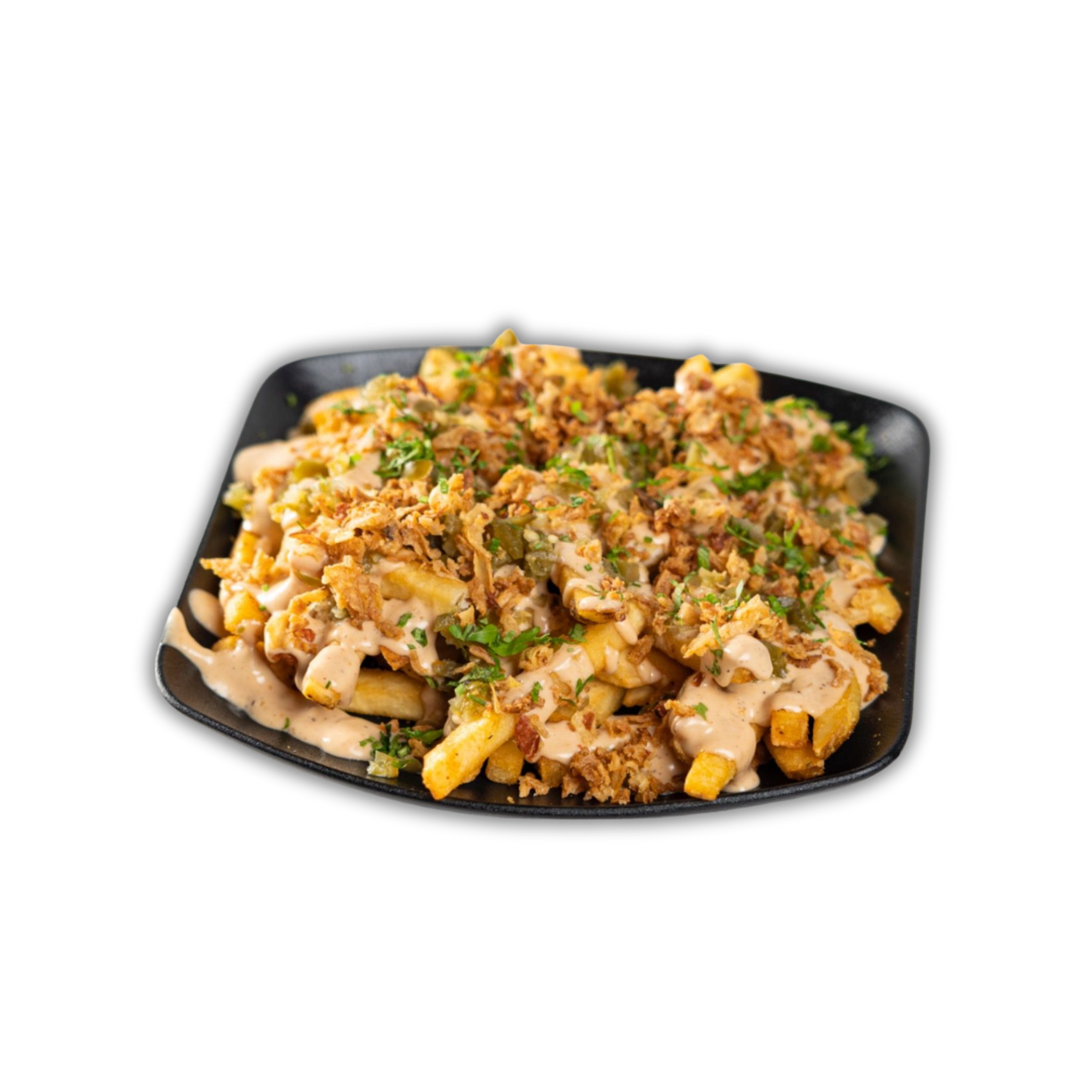 Golden fries topped with melted cheese, seasoned meat, and special sauces.